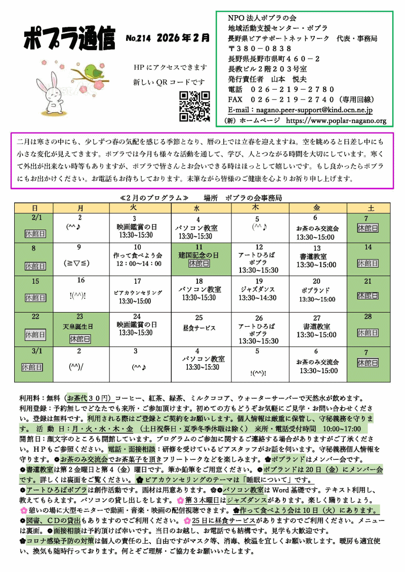 | 〒380−0838 長野市県町460−2 長教ビル2階 203号室 電話 026−219−2780・FAX 026−219−2740 E-mail:nagano.peer-support@kind.ocn.ne.jp ■活動日/月・火・水・木・金(祝祭日及び土曜日は除く)■開所時間/午後1時〜午後5時 |